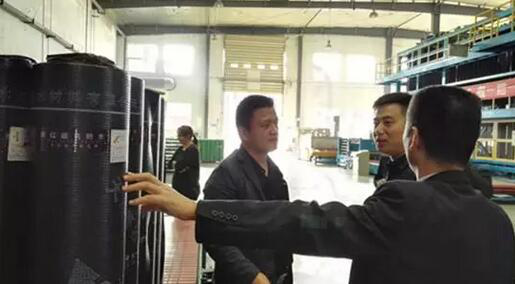 圖為禹紅防水總經(jīng)理楊學(xué)強(qiáng)(右三)介紹企業(yè)產(chǎn)品)