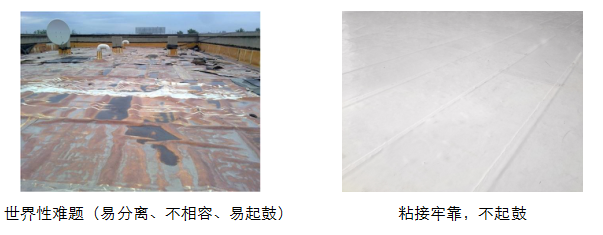 3、專利的高分子片材與瀝青自粘粘接技術,解決了兩層之間易分離、不相容、易起鼓的世界性難題。